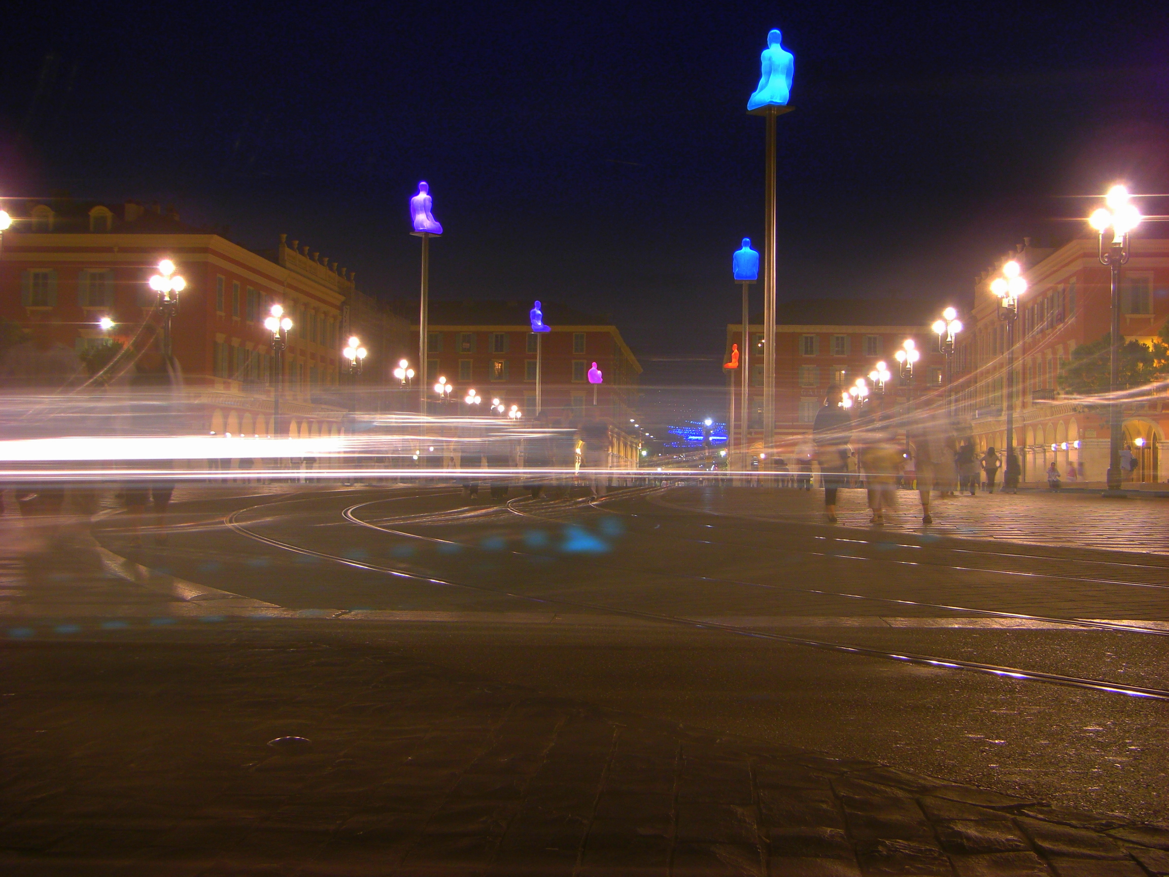 Here’s a photo taken in Nice’s at the Place Massena. Those blue and purple shapes were statues made by Jaume Plensa, a Spanish artist, as part of the Annual Nice Festival in 2009. During the day there were just seven plain white resin statues of men on poles, but at night they lit up from yellow to orange, to red, to puple, to blue, to green. The seven statues represent seven continents and the communication between the different communities of today’s society.