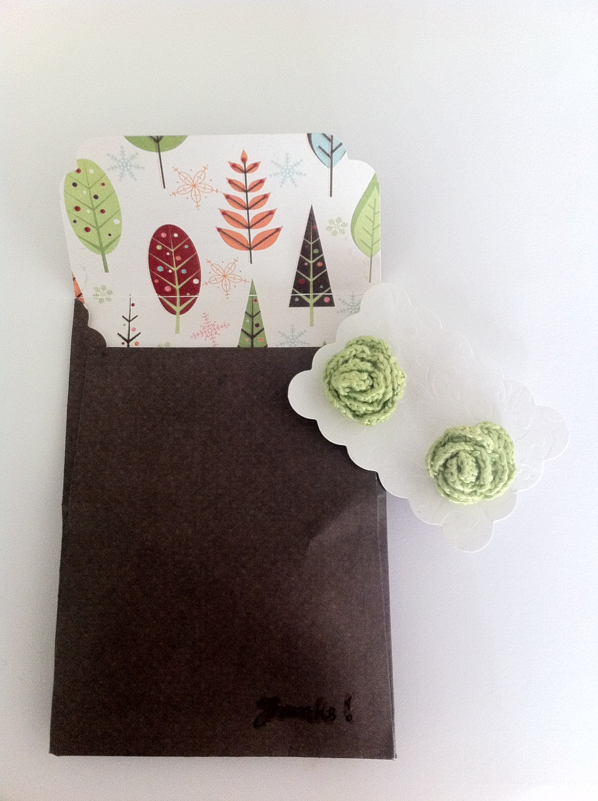 Then…. I fold over the flap of the brown envelope to be greeted with bright beautiful trees. Not so plain anymore! In this photo you can also see the “Thanks” written on the bottom right corner of the brown envelope. Things are looking very promising…